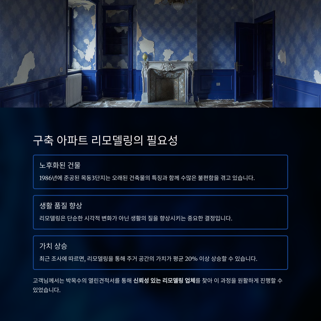 고객님께서는 박목수의 열린견적서를 통해 신뢰성 있는 리모델링 업체를 찾아 이 과정이 원활하게 진행될 수 있었습니다. 최근의 조사에 따르면, 리모델링을 통해 주거 공간의 가치가 평균 20% 이상 상승할 수 있다고 합니다.