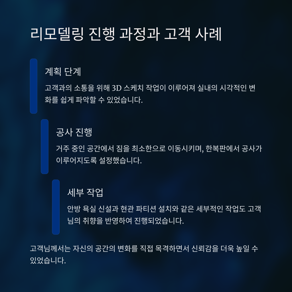 실제 리모델링 과정은 여러 단계를 거쳐 진행되며, 각 단계마다 고객과의 소통이 가장 중요합니다.