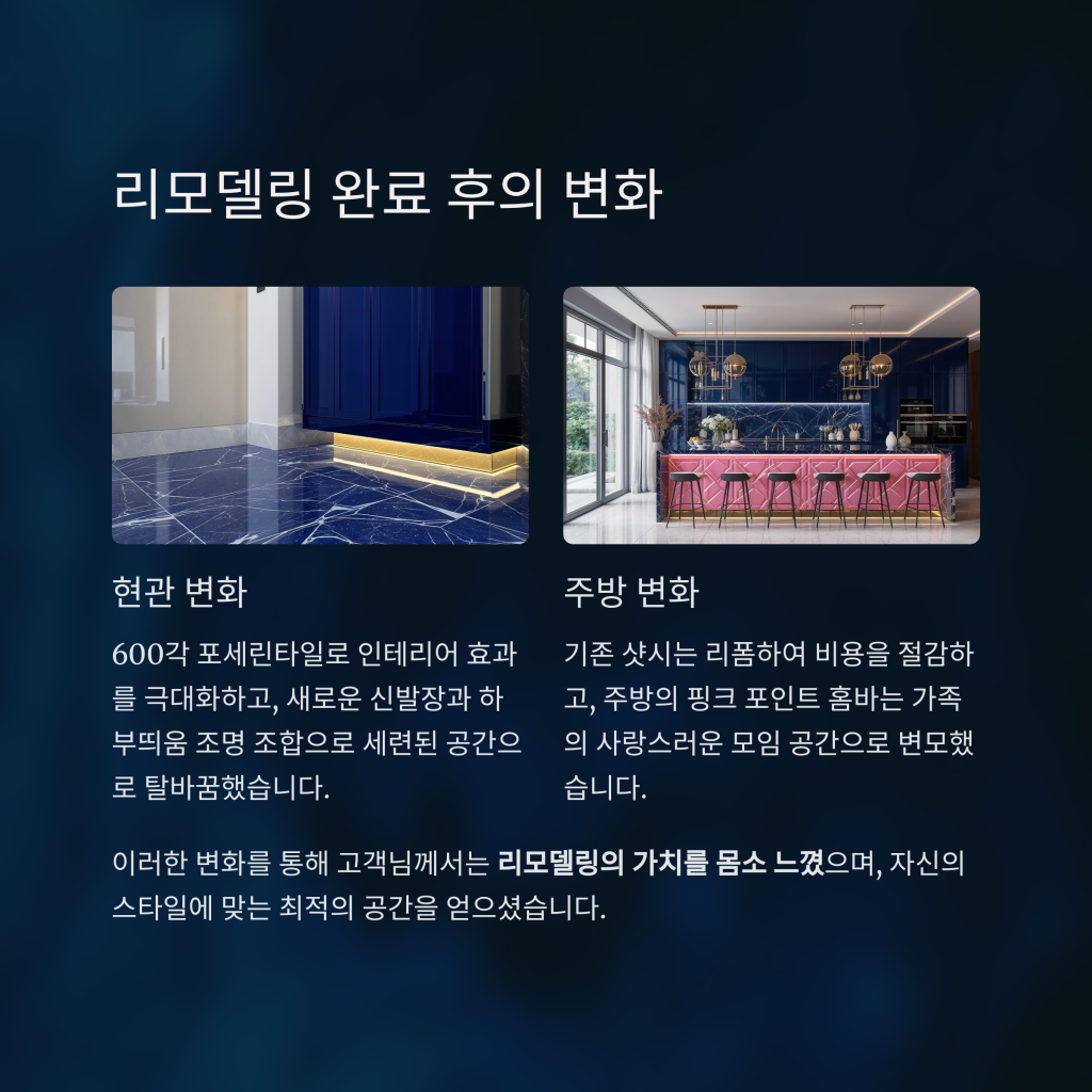 이러한 변화를 통해 고객님께서는 리모델링의 가치를 몸소 느꼈으며, 자신의 스타일에 맞는 최적의 공간을 얻으신 것입니다.