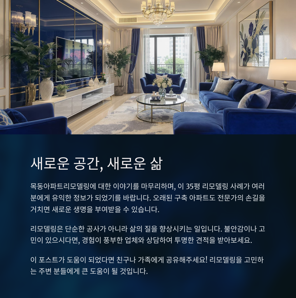 목동아파트리모델링에 대한 이야기를 마무리하면서, 이번 35평 리모델링 사례가 여러분에게 유익한 정보가 되었기를 바랍니다. 오래된 구축 아파트도 전문가의 손길을 거치면 새로운 생명을 부여받을 수 있습니다.